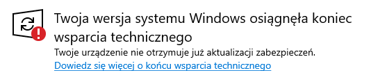 Kilka dni później, już po oficjalnym zakończeniu standardowego wsparcia dla starszego systemu, Windows Update już nic o rozszerzonych aktualizacjach zabezpieczeń (ESU) nie wspomina. Tylko groźnie z czerwonym wykrzyknikiem informuje, że „Twoja wersja systemu Windows osiągnęła koniec wsparcia technicznego.”