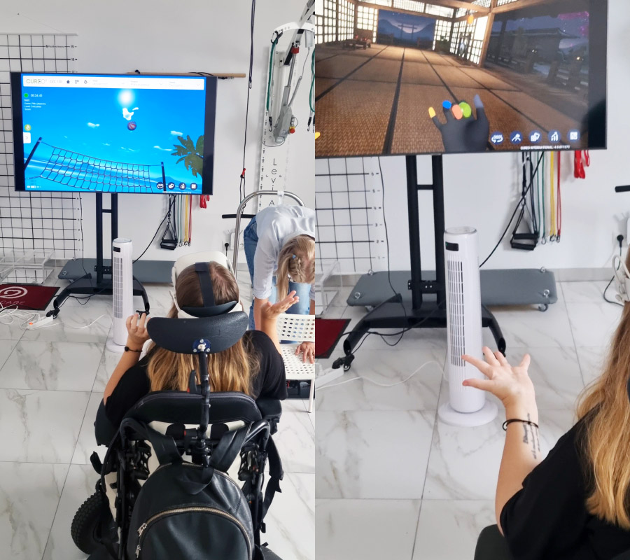 W trakcie szkolenia mogłam przetestować technologię VR Cureo – co prawda nie byłam w tym czasie w podwieszeniu, ze względu na ograniczenia czasowe, ale skoro siedząc na wózku doświadczyłam olbrzymiej radości i wysiłku grając w… siatkówkę plażową z delfinem – z łatwością mogę sobie wyobrazić, że spionizowana, z odciążonymi ramionami, mogłabym ćwiczyć jeszcze intensywniej i jeszcze lepiej się bawić.