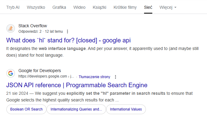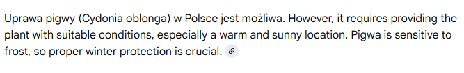 W adresie tym &udm=50 odpowiada za to, że odpowiedź dostaniemy w trybie AI, bez etapów pośrednich. Z kolei &hl=pl odpowiada za to, że odpowiedź będzie po polsku. Tryb AI ma tu pewne problemy – jeśli język nie jest ustawiony na polski a zapytamy po polsku, to możemy uzyskać odpowiedź w mieszance polskiego i angielskiego. Tak jak tu: