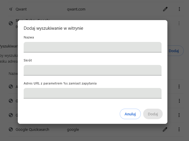 Czy da się tak ustawić nasze wyszukiwanie, by ten proces uprościć? W Google Chrome, z którego podobnie jak większość ludzi na Ziemi korzystam, jest to (względnie) proste. Wchodzimy do ustawień przeglądarki, wybieramy kategorię Wyszukiwarka, następnie opcję Zarządzanie wyszukiwarkami i wyszukiwaniem w witrynach. Tu w sekcji Wyszukiwarka w witrynie mamy przycisk Dodaj. Klikamy w niego i pokazuje nam się takie oto okienko: